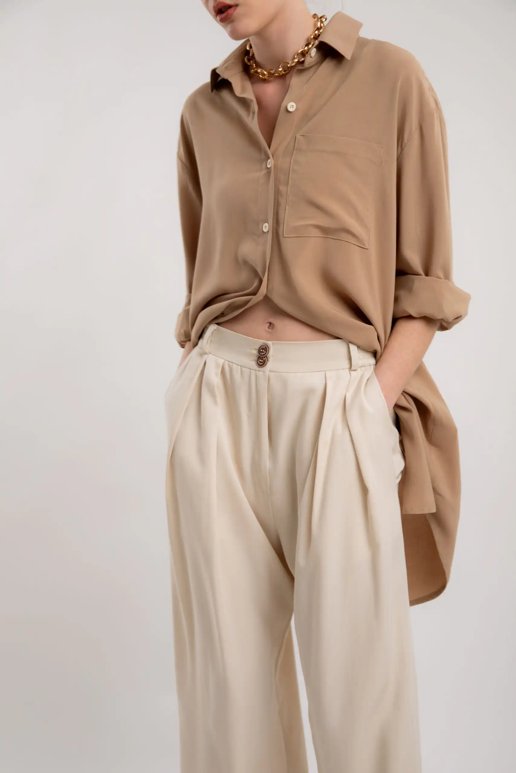 Lagane pantalone od 50% Lyocella (Tencel®) i 50% Modala, širokog kroja, sa džepovima sa strane i duplim kopčanjem, idealne su za sve prilike i stilove. Savršeno stoje različitim tipovima građe, dugačke su i ležerne.