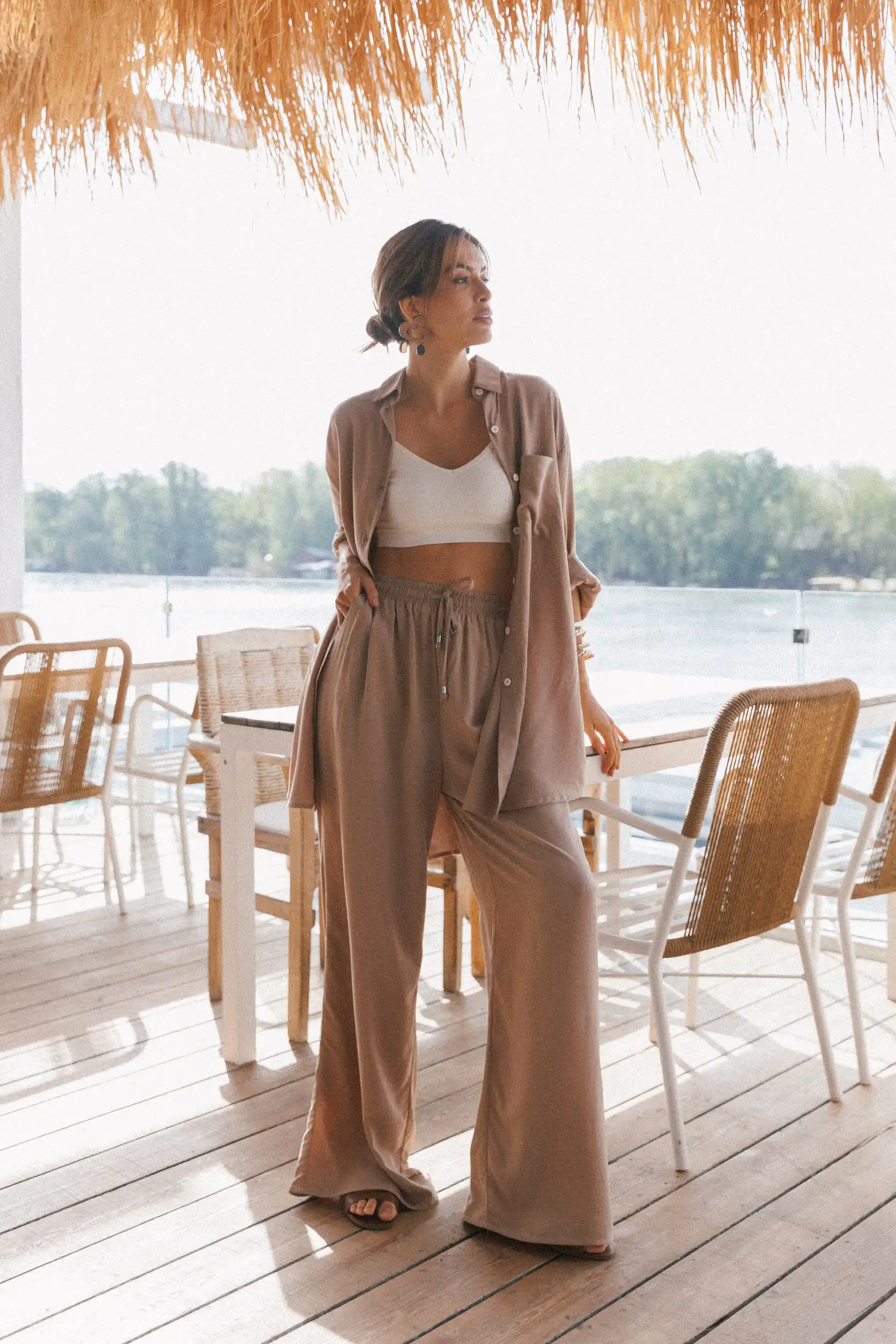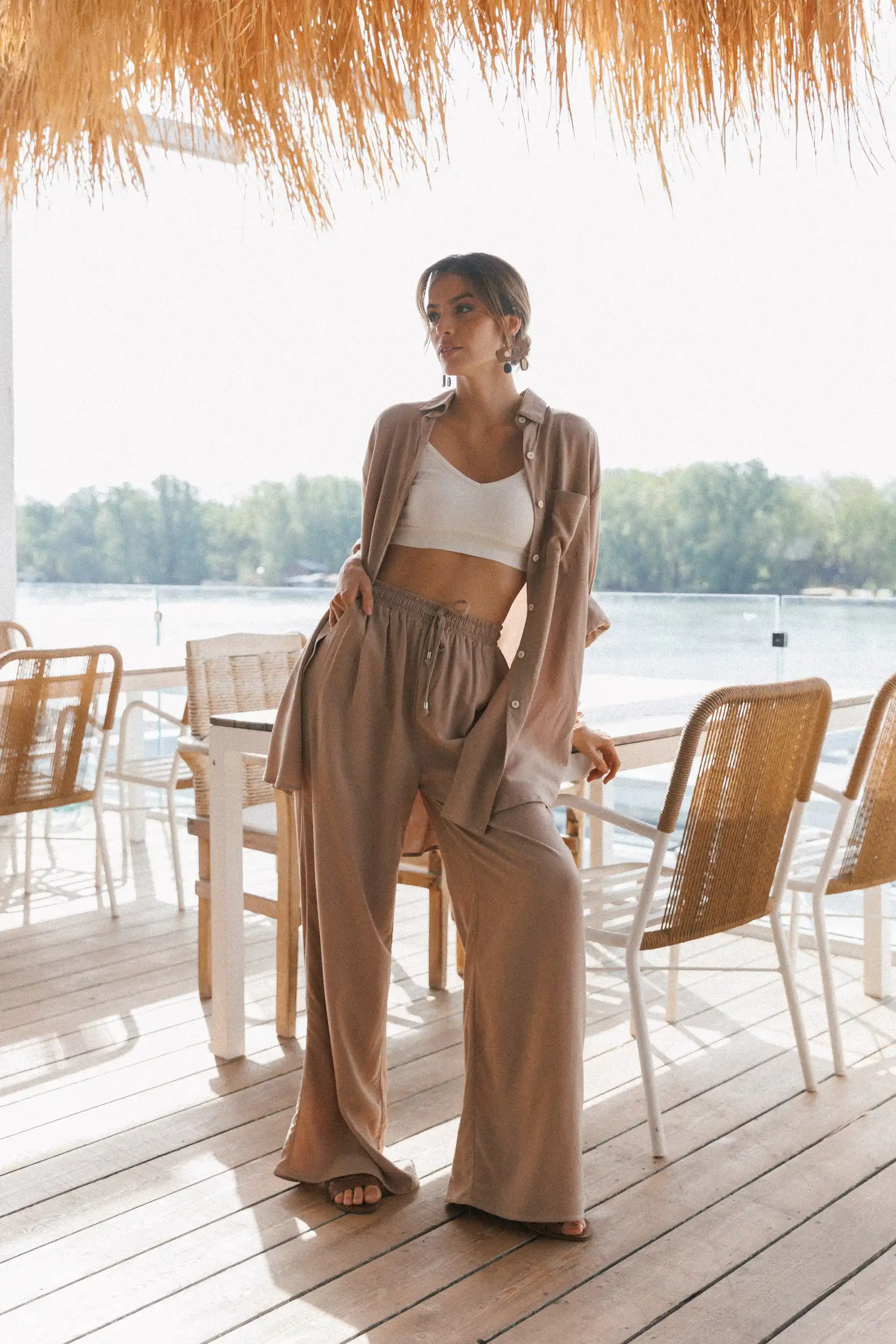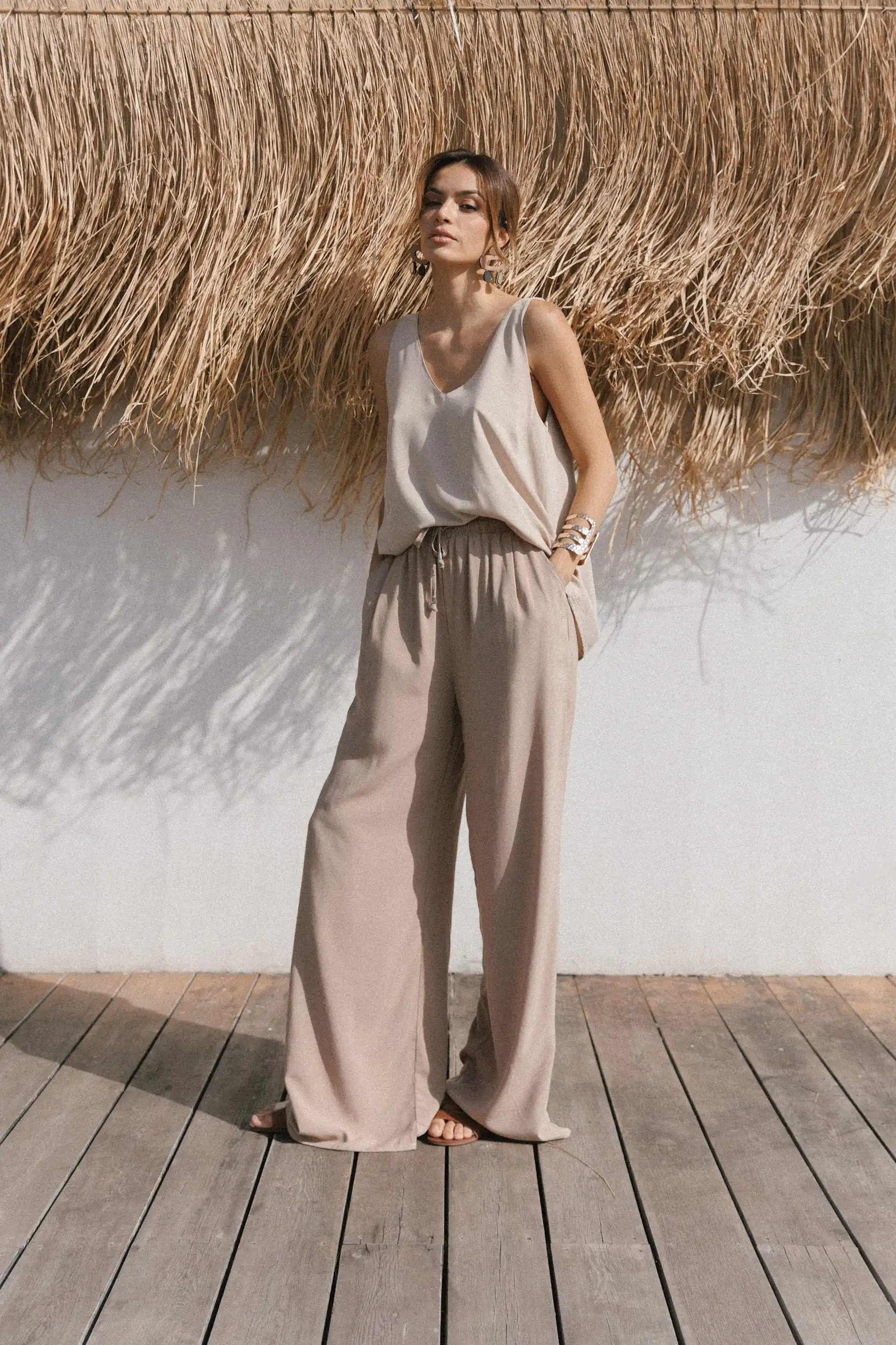 Letnja verzija Palazzo trenerke, lagane pantalone od viskoze, savršene za visoke temperature i vrele letnje noći. Precizno dizajnirane i proizvedene po najvišim standardima, pred vama su Palazzo pantalone sa prelepom siluetom koja je opuštenija u predelu bokova, i širi se skroz do poda. Dugačkih nogavica, imaju visok struk sa lastišem, kose prednje džepove i po dve falte na prednjem delu. Mogu da se nose u kombinaciji sa majicom na bretele Laganini, a generalno se lako kombinuju sa svim letnjim gornjim delovima.