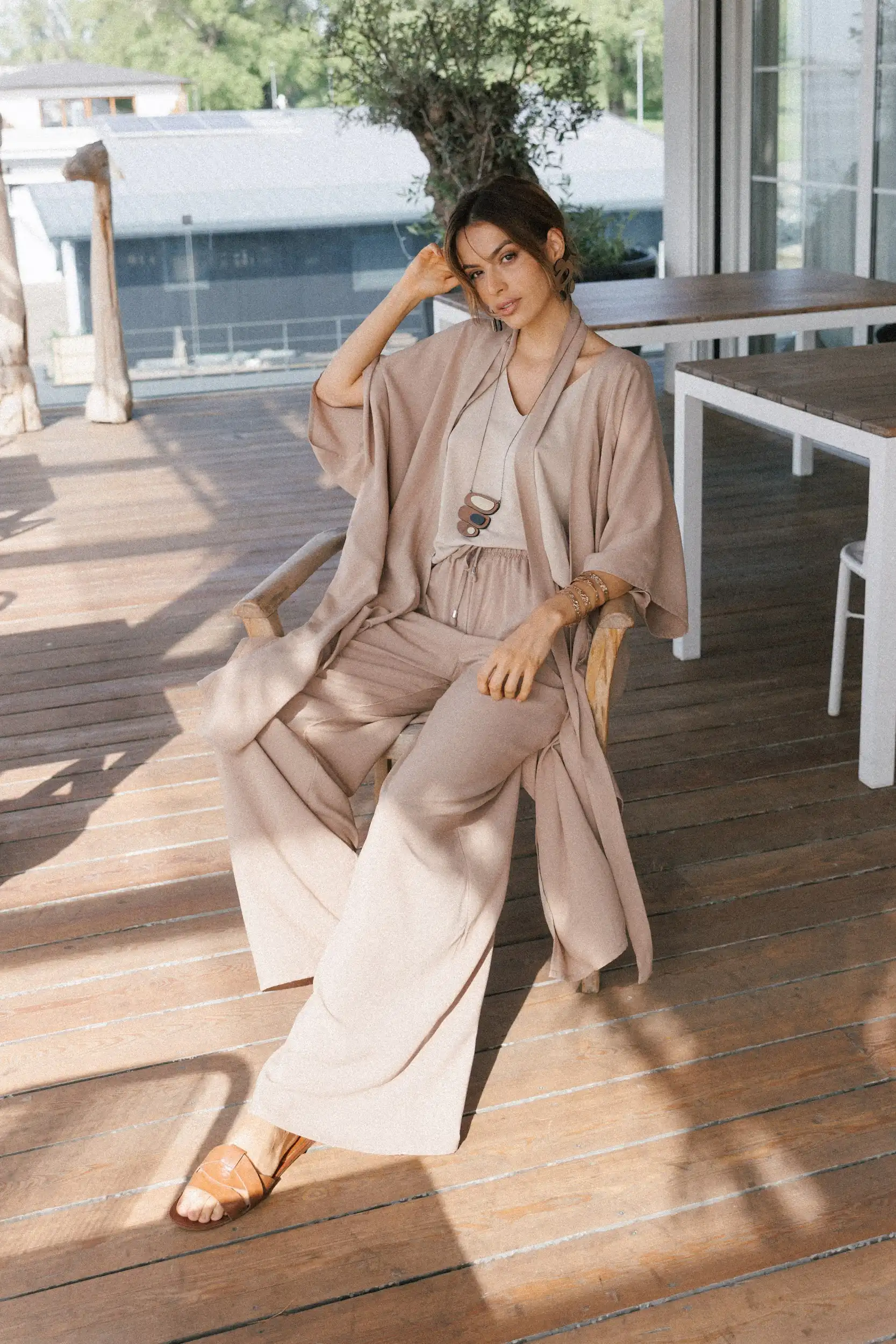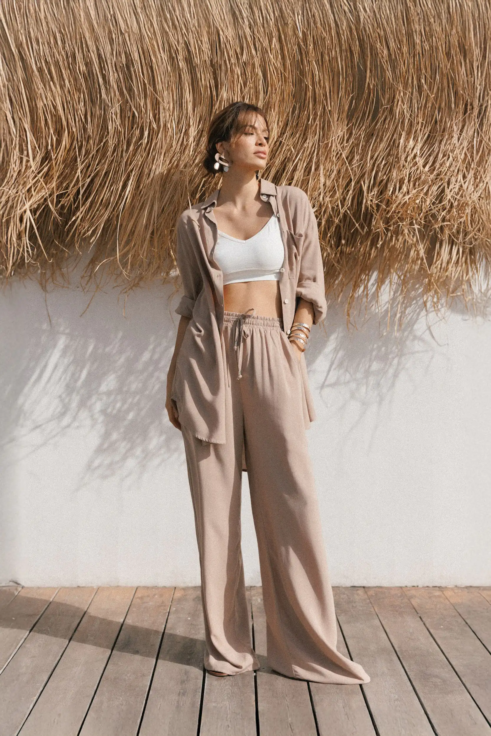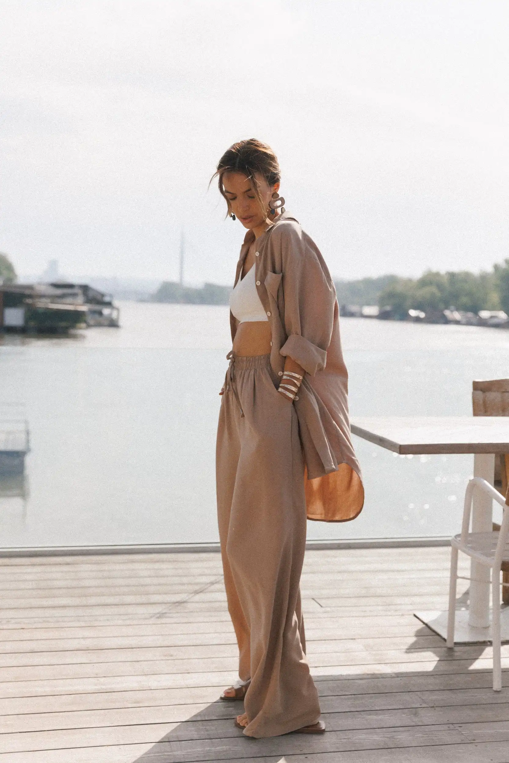 Letnja verzija Palazzo trenerke, lagane pantalone od viskoze, savršene za visoke temperature i vrele letnje noći. Precizno dizajnirane i proizvedene po najvišim standardima, pred vama su Palazzo pantalone sa prelepom siluetom koja je opuštenija u predelu bokova, i širi se skroz do poda. Dugačkih nogavica, imaju visok struk sa lastišem, kose prednje džepove i po dve falte na prednjem delu. Mogu da se nose u kombinaciji sa majicom na bretele Laganini, a generalno se lako kombinuju sa svim letnjim gornjim delovima.