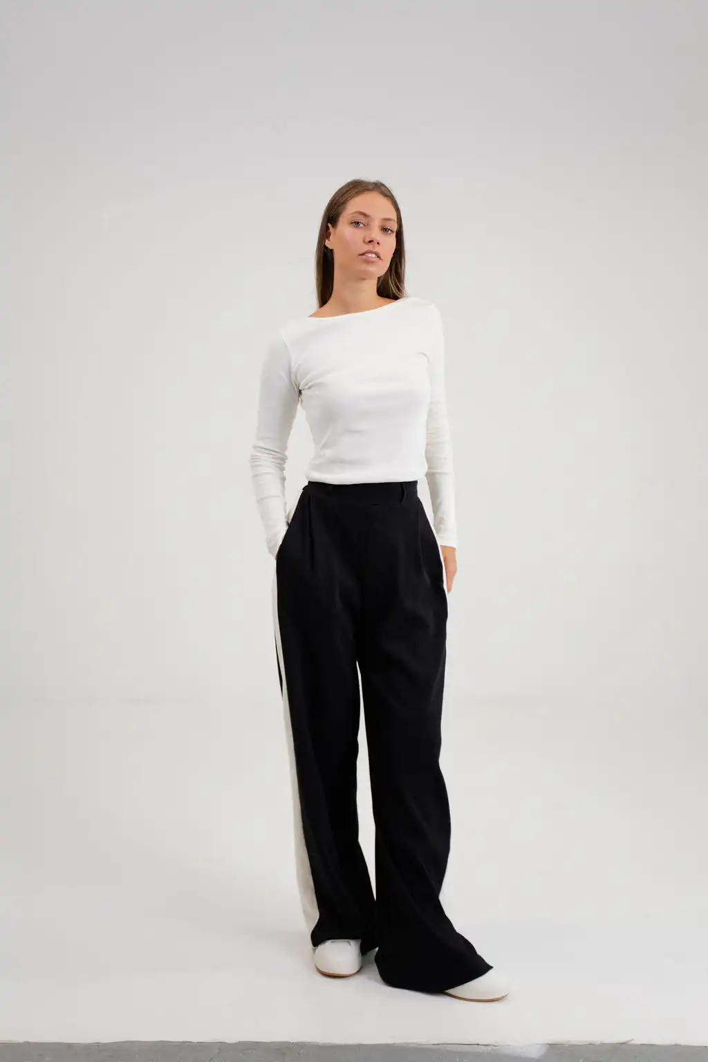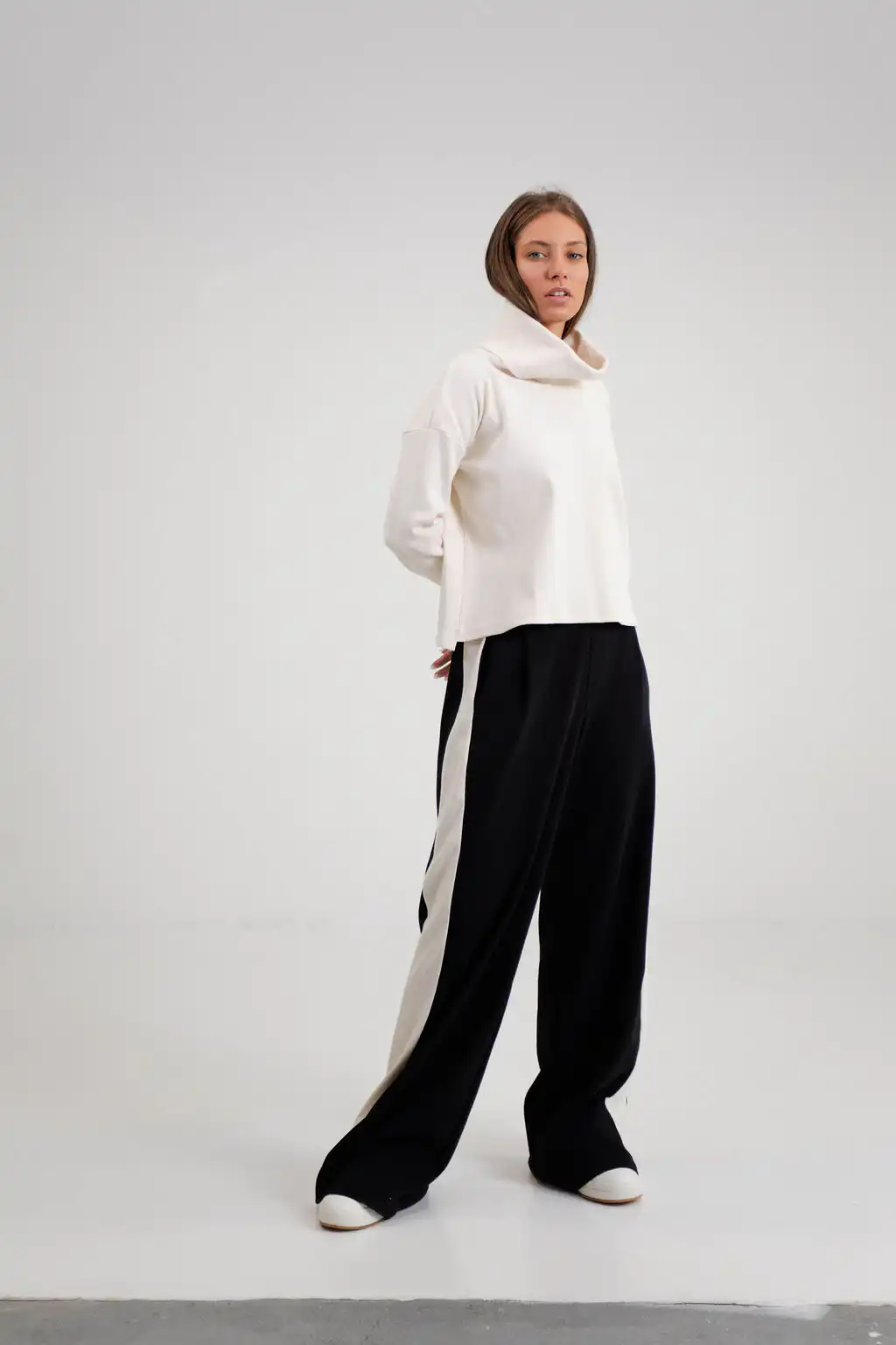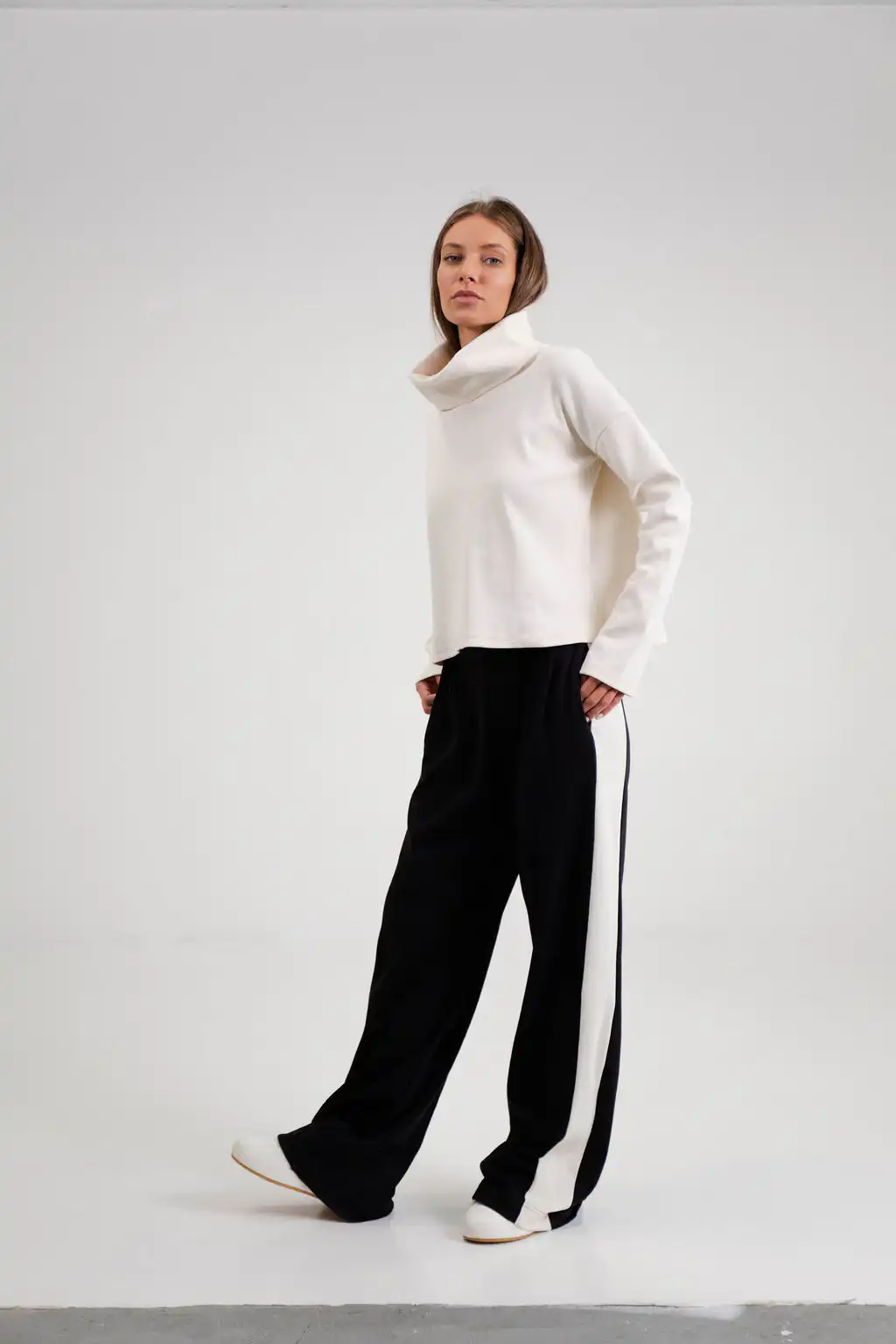 Široke pantalone od 100% organskog pamučnog interloka, sa širokom belom trakom i džepovima sa strane su savršen primer kombinacije komfora i stila, a bez neprijatnog stezanja. Pružaju osećaj prozračnosti i udobnosti, što ih čini idealnim za celodnevno nošenje. Zahvaljujući opuštenom, ali stilizovanom dizajnu, savršene su za poslovne prilike u svim radnim okruženjima, gde je neophodan balans između formalnog i udobnog.