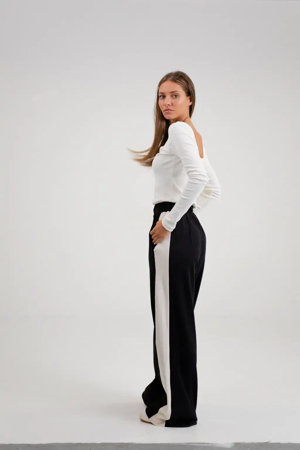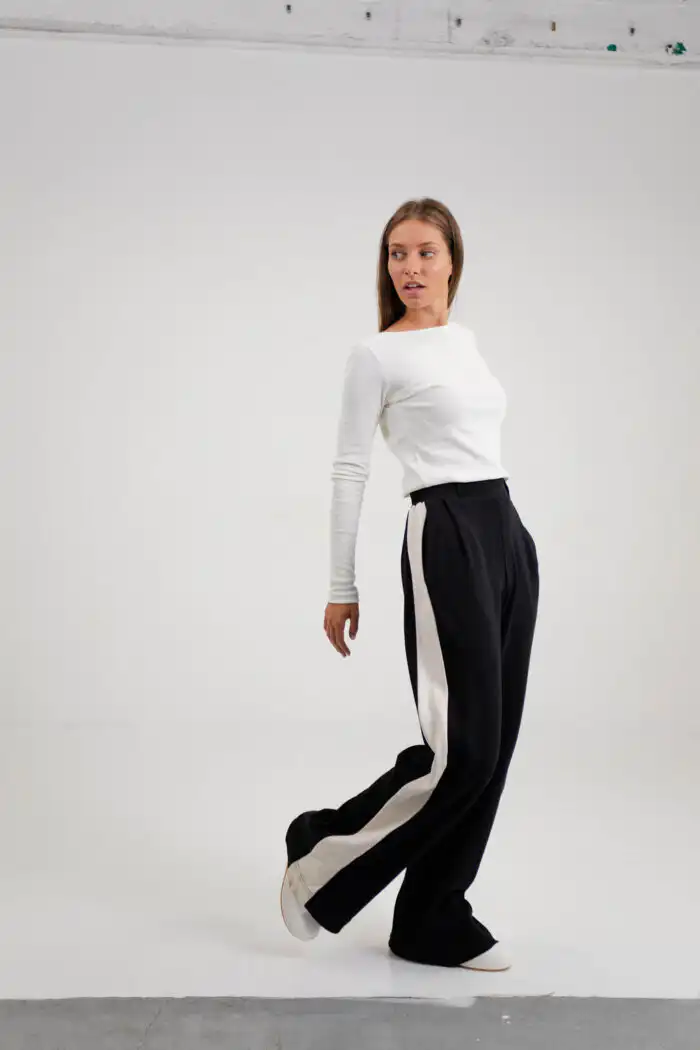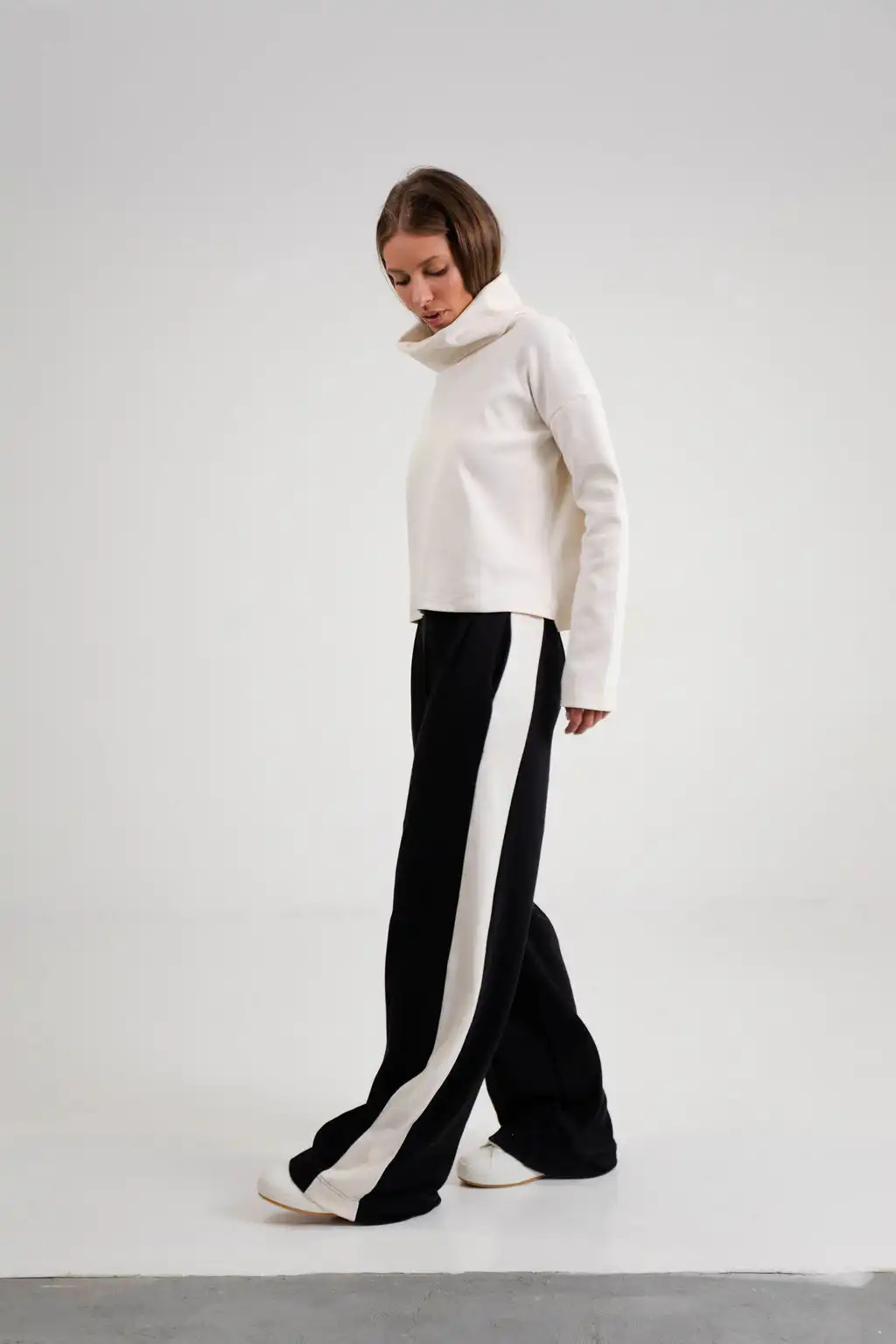Široke pantalone od 100% organskog pamučnog interloka, sa širokom belom trakom i džepovima sa strane su savršen primer kombinacije komfora i stila, a bez neprijatnog stezanja. Pružaju osećaj prozračnosti i udobnosti, što ih čini idealnim za celodnevno nošenje. Zahvaljujući opuštenom, ali stilizovanom dizajnu, savršene su za poslovne prilike u svim radnim okruženjima, gde je neophodan balans između formalnog i udobnog.