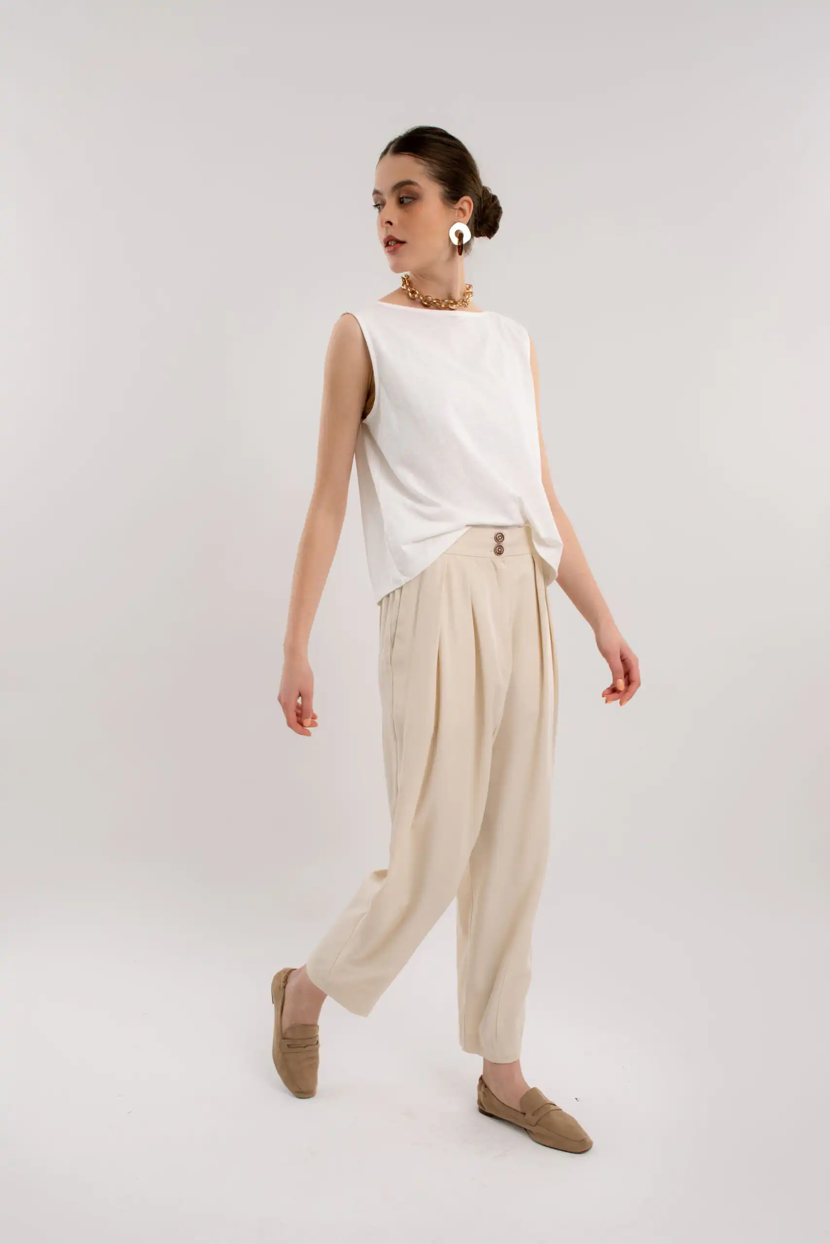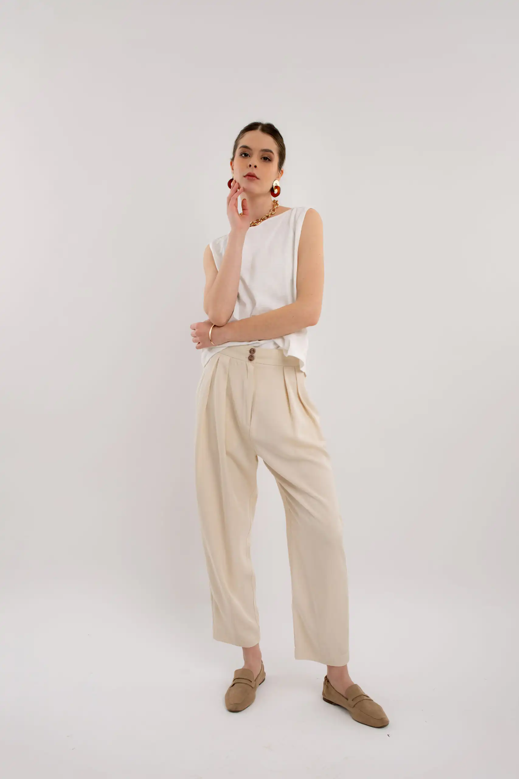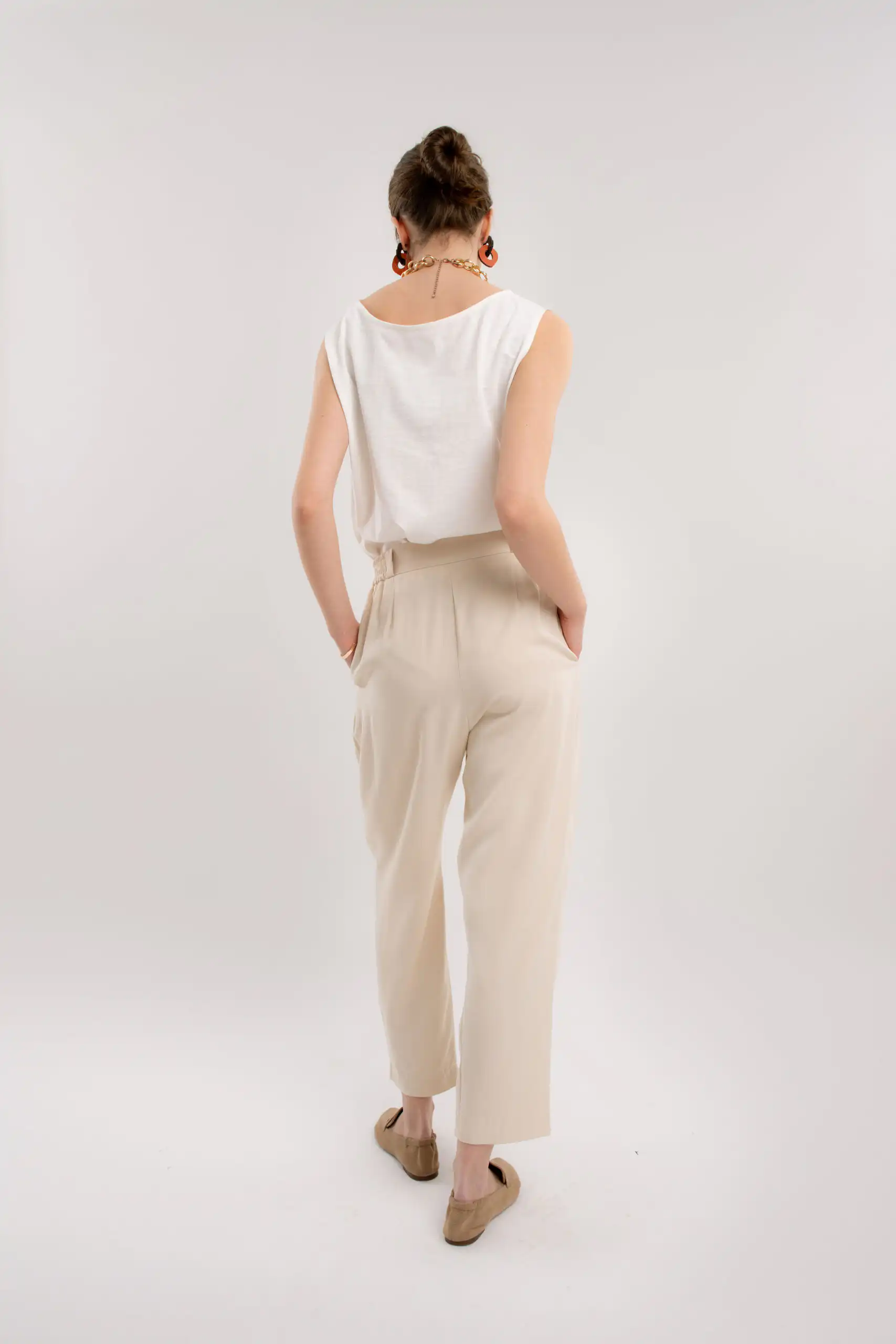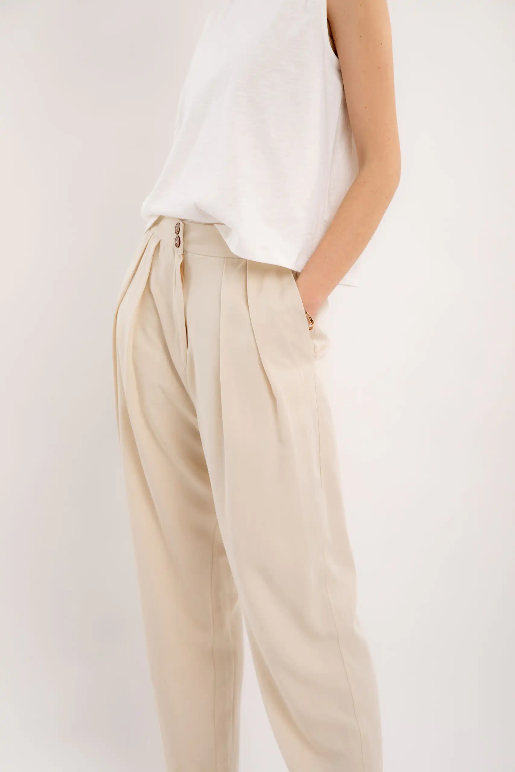 Lagane pantalone od 50% Lyocela (Tencel®) i 50% modala, predviđene dužine do malo iznad članaka, carrot kroja sa suptilnim faltama na prednjem delu, sa džepovima sa strane i duplim kopčanjem, idealne su za sve prilike i stilove. Savršeno stoje različitim tipovima građe.