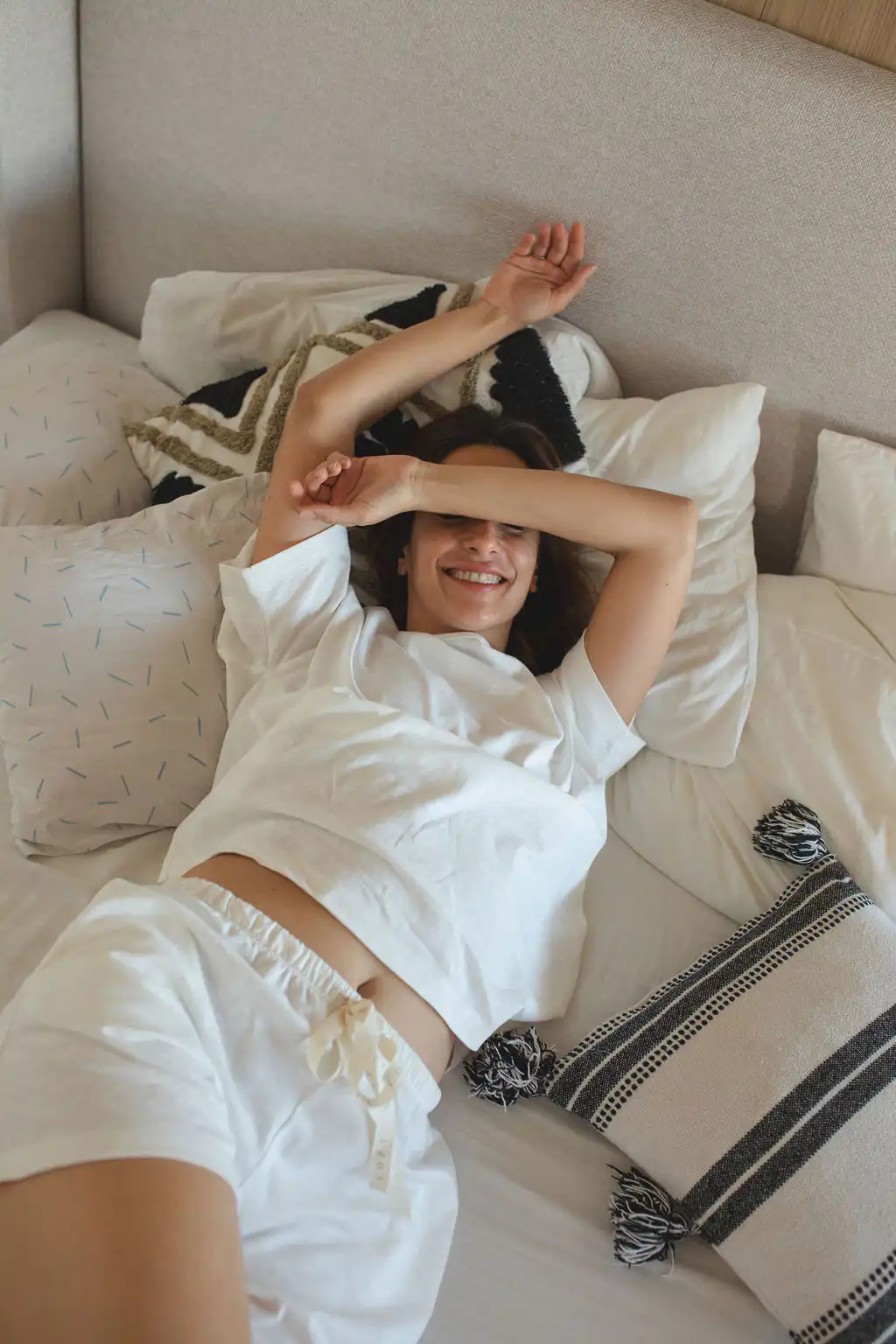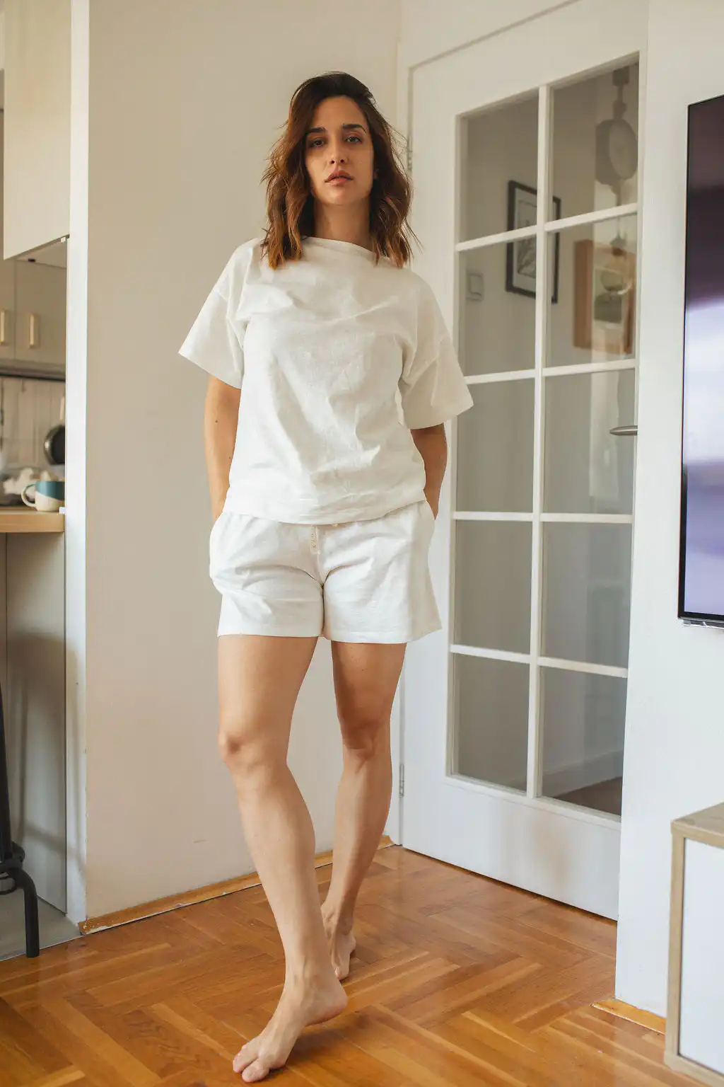 Mekana i udobna, ova letnja pidžama od organskog pamuka stvorena je da ti pruži savršen osećaj tokom toplih noći. Kroja jednostavnog i prozračnog, sa šortsem i majicom kratkih rukava, ona je osmišljena za slobodu pokreta i potpuni komfor. Lako se uklapa u tvoj ritam – bilo da je nosiš u krevetu, dok uživaš u jutarnjoj kafi ili u opuštenim kućnim trenucima.