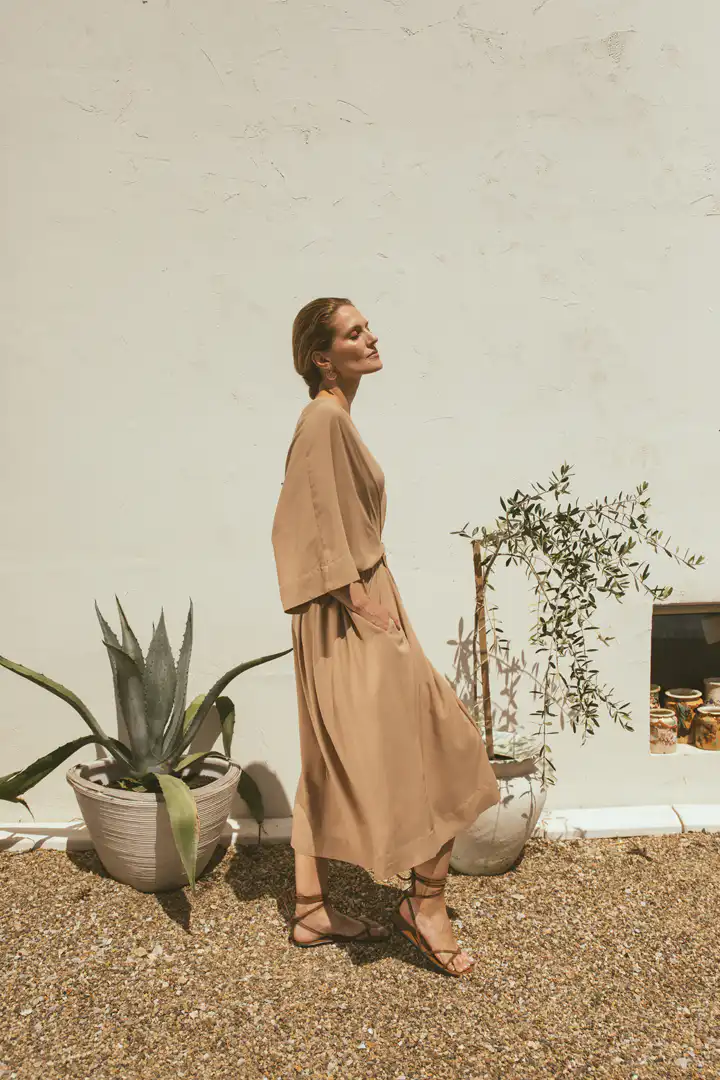 Otkrijte Haljinu Kimono, dostupnu u šarmantnim varijantama floral i sand, koja predstavlja idealnu simbiozu modernog dizajna i tradicionalnog šarma kimono stilova. Izrađena od 100% viskoze, ova haljina nudi fluidnost i eleganciju uz midi dužinu i rukave do lakta. Posebnost joj daje tanki pojas za vezivanje, ugrađen u dizajn, koji omogućava prilagođavanje po vašoj meri, ističući struk na suptilan način.