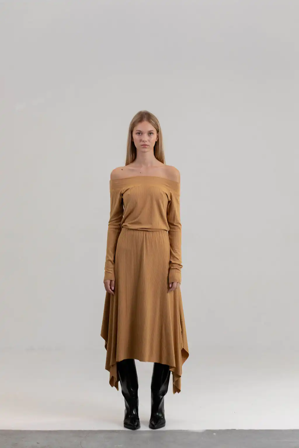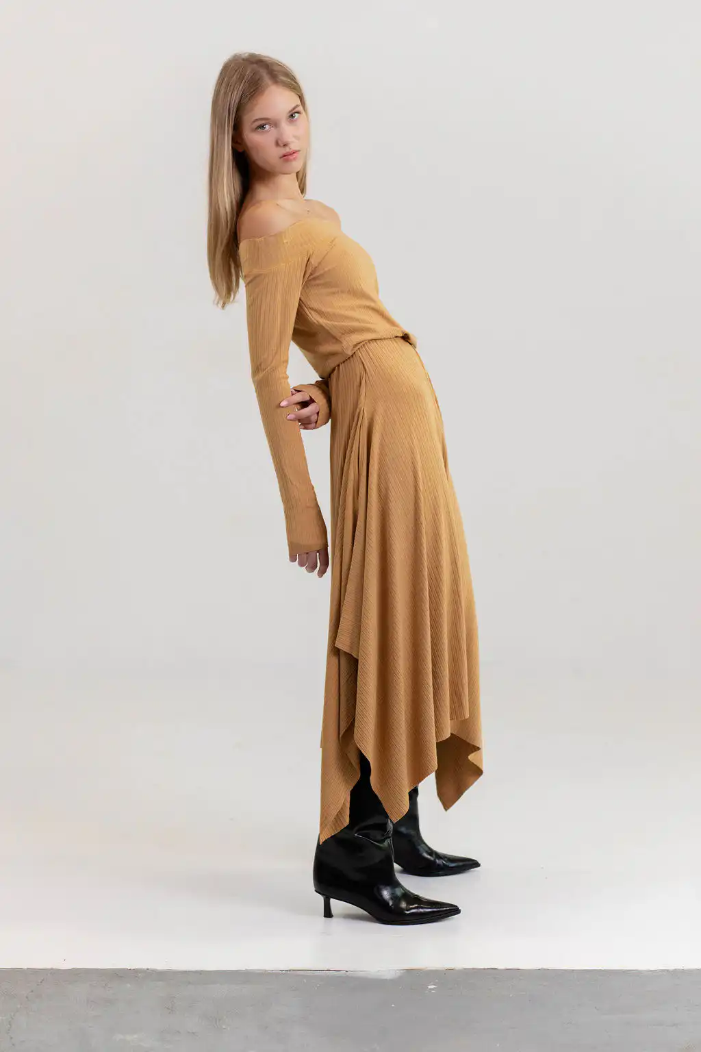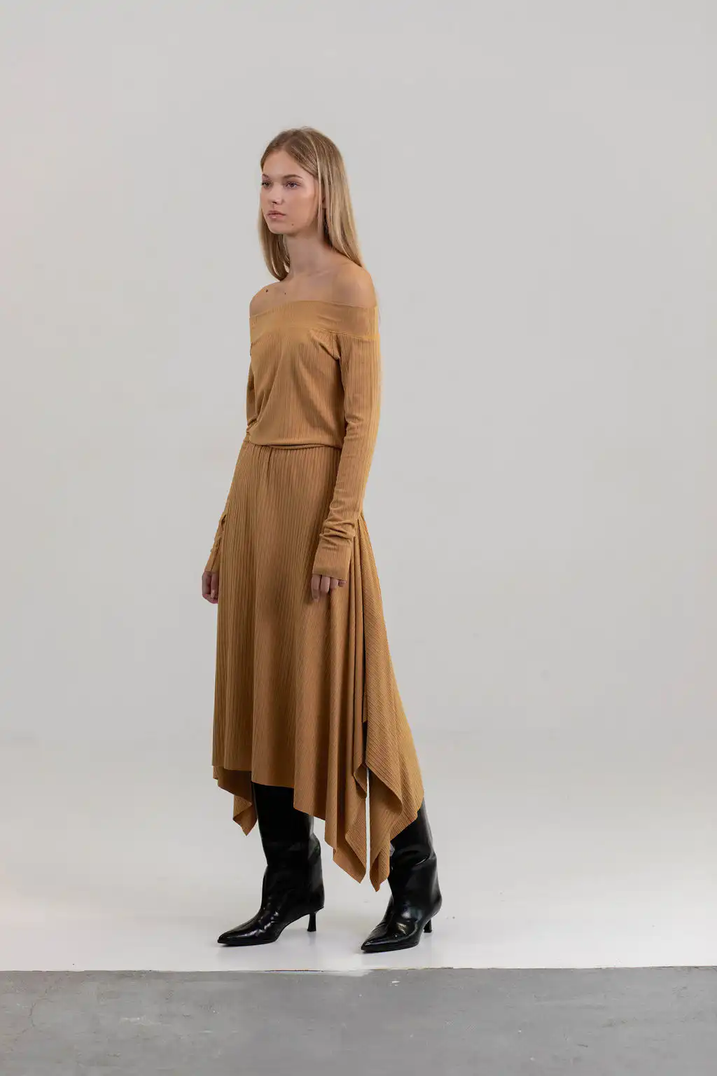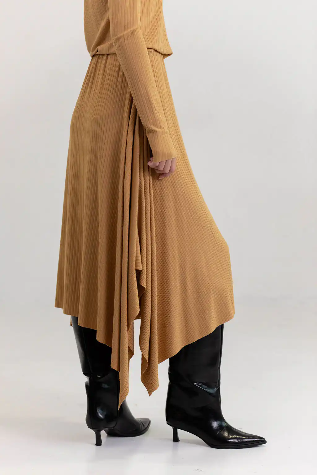 Suknja Eloise od pletene viskoze sa asimetričnim rubom i lepršavim krojem. Savršena kombinacija udobnosti i elegancije.